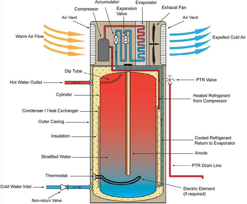 Heat pump water heater works on principle just like an air conditioner or like the refrigerator. It absorbs warmth from the air and transfer it to heat water. Hence it’s also referred to as air-source heat pumps.It operates on electricity but is more efficient than a conventional electric water heater.