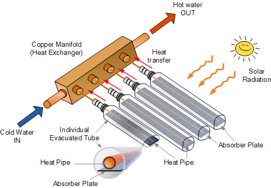 The vacuum tubes absorb solar radiation and transfer into heat, pass to the fin by the tube wall, and then transfer to the heat pipe by the fin, after heat pipe absorbs heat, heat pipe end vaporization, transfer to condenser, then circulation because of gravity, heating the water (medium) in the manifold.
